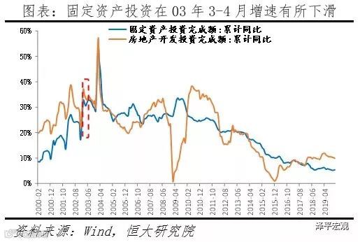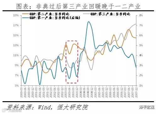 2003年非典期间,交通运输、住宿餐饮、金融等服务业所受冲击较大,二季度GDP分项同比分别较一季度下滑5.4、3.6和3.6个百分点。