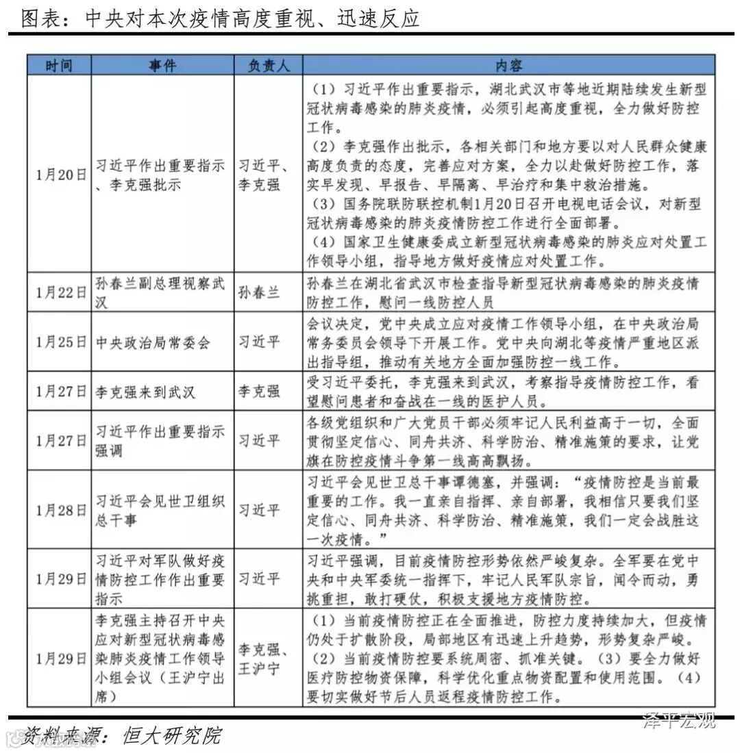从历史经验和当前进展来看,第一种情景目前概率更大,主要是基于此次疫情防控的及时性和力度明显强于2003年非典时期,但是也要做好第二种和第三种情景的准备,坚持底线思维。第一,反应迅速。非典历时半年,但从2002年11月16日首发病例到2003年4月17日政治局会议高度重视相隔5个月时间,而此次疫情从12月8日首发病例到1月20日总书记指示相隔不到1个半月。第二,强大的动员能力和防控力度超前,抗击疫情经验更丰富。参考过去抗击“非典”的经验,采取了对重点疫区进行管控、武汉和湖北其他地市封城、及时提供各类医疗物资、“小汤山模式”医院定点诊疗感染病例、延长春节假期防止人员大幅流动等措施。截至1月29日,新冠病毒新增疑似和确诊病例增速大幅放缓。非典时期从4月17日政治局会议到6月20日小汤山医院最后的患者出院,仅2个月时间便基本扫清疫情,因此我们审慎乐观估计大概率的情况是疫情及其影响主要在一季度。