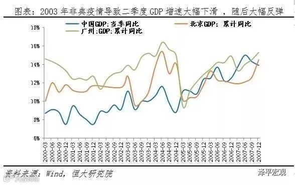 新冠肺炎疫情与2003年的非典疫情极为相似,从非典疫情可观察疫情对经济的影响路径和程度。非典疫情主要影响当年二季度的经济,新冠病毒的影响主要在今年一季度。2003年四个季度的GDP增速分别为11.1%、9.1%、10%和10%,全年10%。2003年3-4月非典疫情大规模爆发,引起政府重视并采取相应措施,二季度中国GDP同比较一季度大幅快速回落2个百分点。广州、北京等疫情较为严重的省市所受冲击较大,二季度北京、广州GDP累计同比分别为9.6%和13.4%,较1季度下滑3.1和0.5个百分点。