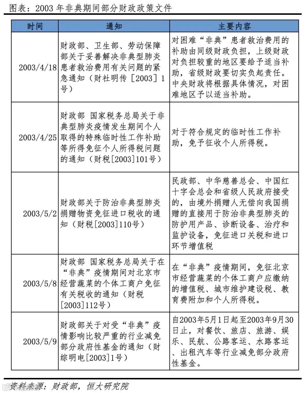财政政策方面,我国主要通过财政减免、补助补贴、国债支持三类支持措施抗击非典。1)财政减免方面,2003年5月财政部出台《财政部关于对受“非典”疫情影响比较严重的行业减免部分政府性基金的通知》(财综明电[2003]1号),针对受疫情影响较大的餐饮、旅店、旅游、娱乐、民航、公路客运、水路客运和出租汽车等行业减免部分政府性基金。此外,非典期间我国还对防治非典的捐赠物资免征进口税,对于在北京经营蔬菜的个体工商户免征增值税和个人所得税等,对于非典期间取得的临时性工作补助免征个人所得税。2)补助补贴方面,非典期间财政部对参与非典防治工作的卫生医务人员提供临时补助,分200元/天和100元/天两档;另外,对于农民和城镇经济困难的非典患者的医疗费用由救治地政府负担。3)国债支持方面,2003年5月9日,曾培炎副总理主持召开会议,专题研究和安排部署加快非典防治设施建设工作,会议决定适时调整国债资金投向,在非典以来已安排15.5亿元用于全国疾病预防控制网络建设的基础上,再增加投资8.12亿元,重点支持疫情比较严重地区的非典防治,用途包括医疗设备采购、医院隔离室改建、医疗垃圾与污水处理、专用运输车购置等。