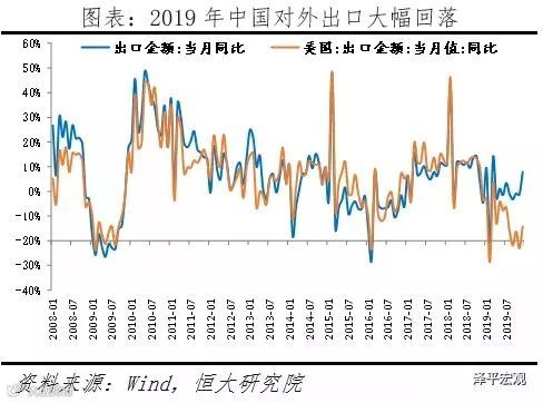 外部,加入WTO以后,2003年出口同比从2001年7%升至30%左右。受全球经济放缓和中美贸易摩擦影响,2019年中国对外、对美出口分别为0.5%和-12.5%,创2008年以来新低。