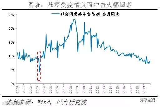 受非典影响,2003年上半年居民减少外出,对餐饮、旅游等相关消费造成负面冲击。2003年4-6月社会消费品零售总额同比分别为7.7%、4.3%、8.3%,较2002年同期分别减少0.5、5和0.3个百分点。而当6月疫情得到有效控制后,前期被抑制的消费需求大量释放,7月社零同比迅速上升至9.8%。