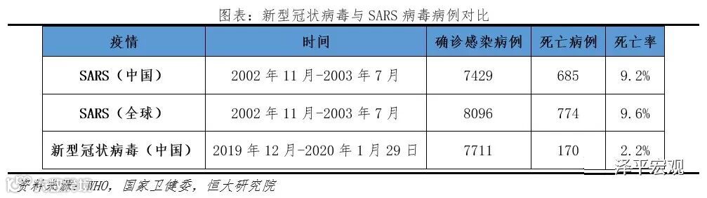 据WHO数据,2002年11月-2003年7月全球确诊感染SARS患者共8096例,其中死亡774例,死亡率9.6%。据国家卫健委公开数据,截至2020年1月29日,全国累计确诊案例7711例,累计死亡病例170例,死亡率2.2%。