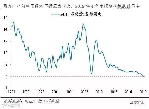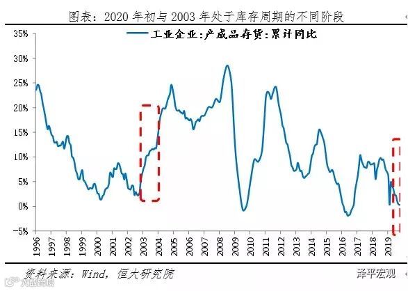 内部,经济处于不同的发展阶段,当前我国经济增速换挡,人口老龄化加重,宏观杠杆率较高,经济下行压力较大,2019年底经济暂稳但基础不牢,且财政货币政策空间小于2003年。