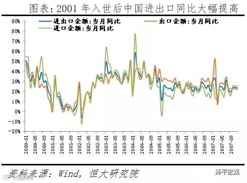 2003年中国正处于入世后的全球市场红利期,美国因911事件需要携手中国共同反恐,中美关系温和,国际贸易活动相对活跃。2001年中国加入WTO开启改革开放新篇章,叠加美国出于反恐需要加强与中方合作,我国进出口贸易迅速扩张,出口同比自2001年7%附近上升至2003年30%水平。