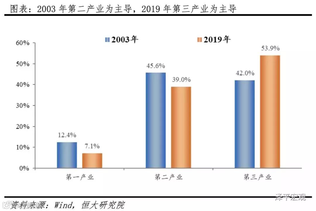 2019年第一、二、三产业分别占比7.1%、39%和53.9%,一二产业分别较2003年下降5.3和6.6个百分点,第三产业提高11.9个百分点。2019年最终消费支出、资本形成总额和净出口的经济贡献率分别为57.8%、31.2%和11%,其中消费的贡献率高于2003年22.4个百分点,资本形成总额的贡献率低于2003年38.8百分点。