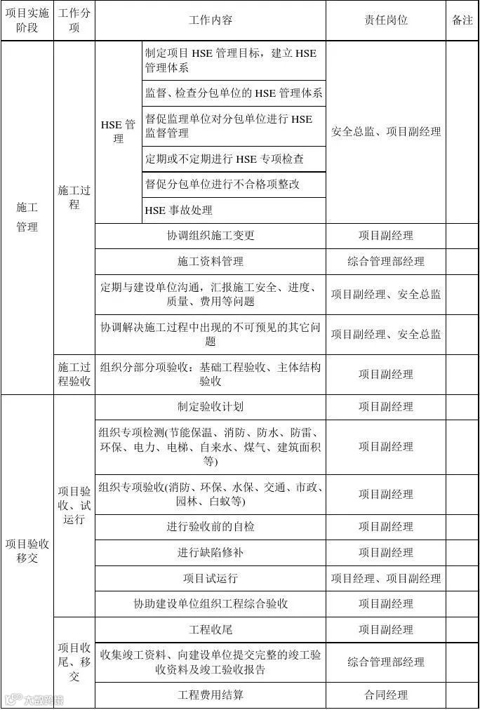 (a)施工阶段主要工作为完成土石方工程、地基基础工程、主体结构工程、装修工程、水电安装工程、室外道路管网等市政工程、景观绿化工程等工程项目的施工,进行施工过程质量控制、进度控制、变更控制、施工费用控制、施工安全、标化工地管理,分项、阶段验收管理,按要求的工期全面完成施工任务。