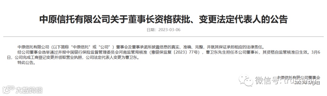 3月6日,中原信托有限公司(以下简称“中原信托”)官网发布《关于董事长资格获批、变更法定代表人的公告》(以下简称为《公告》),《公告》显示,经董事会审议通过并报河南银保监局核准,曹卫东中原信托董事长资格自核准之日起生效。此外,中原信托已完成法定代表人工商变更程序,公司法定代表人正式变更为曹卫东。