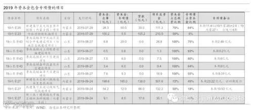 但从实际项目情况来看,首先,作为项目资本金的专项债仅有四只,专项债占资本金比重平均在52%。从省份看只有内蒙和山东两个省,涉及10个项目,项目总投资1052.6亿元,涉及专项债总额282.6亿元(大多分几年发行),其中本年发行金额共计78.7亿元、占2019年下半年基建专项债的比重仅不到3%,专项债占资本金比例均值为52%,资本金比例均值高达80%。可见,由于收益性的要求(要求项目收益偿还专项债券本息后专项收入具备融资条件),资本金包含专项债的项目并不多,资本金仍以地方财政或项目承建方自筹为主,且项目的资本金比例较高、撬动的社会融资金额有限。