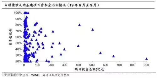 其次,从专项债不作为资本金、但作为资金来源的基建项目来看,项目资本金比例较高、平均在50%以上。我们统计了19年6月~9月发行的专项债对应基建项目167个(剔除前面专项债作为资本金的项目),资本金比例在20%~100%之间不等、加权平均为51%,专项债占项目投资总额的比重在2%~100%之间、加权平均为55%。这意味着这些项目的配套贷款占比较低,杠杆撬动作用有限。主要原因或在于符合金融机构要求的项目少,而很多基建项目收益有限、项目周期很长,另外也与非标融资受限、城投融资难度增加有关。