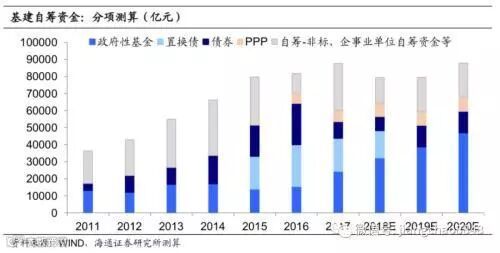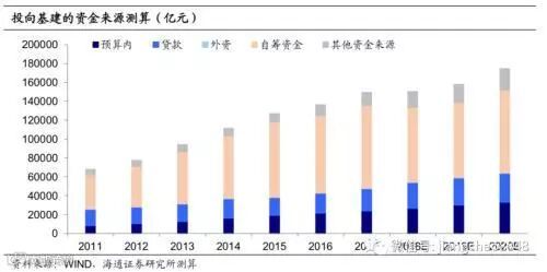 非标拖累边际改善,但可能还是负增。除了以上项目外,自筹资金部分还包括非标和企事业单位自筹资金,2014-2015年这两部分总金额可能在每年3万亿左右,但到了2018~2019年或降至每年2万亿以内,主因非标拖累。由于金融监管与地方政府隐性债务的管控,18、19年投向基建的新增信托和新增委托贷款分别为-2800和-1800亿元,考虑到非标投向地产的管控,我们预计2020年投向基建的新增非标资金有望继续降幅收窄。企事业单位自筹资金或保持平稳。