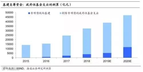 我们假设2020年剔除专项债之后的政府性基金支出(投向基建)同比降至5%,则这部分资金投向基建的规模相比于19年小幅增加1700亿元左右。而投向基建的专项债则受益于额度增加和投向基建的比重提升,相对于19年将增加6500亿元左右。我们预计,政府性基金的基建领域支出有望较19年增加21%。