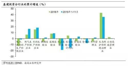 另一类是地方政府主导的项目,例如公路、水利、公共设施等行业。这类行业投资进一步增长的空间较大,但是受地方政府的财力限制,配套资金不足,因此19年以来投资增速(除水利外)反而出现小幅下行。除此之外,还有几个行业固定资产的投资增速保持高速增长,如生态环保、燃气和水供应等,不过这些行业的投资规模相对较小,对于基建投资整体的拉动作用也相对有限。