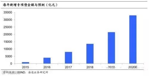 2020年有多少专项债?预计3.3万亿左右。2015年以来,每年新增专项债规模为1000亿、4000亿、8000亿、1.35万亿和2.15万亿,较前一年分别增加3000、4000、5500、8000亿元,呈现增量逐年递增的格局。在“开正门、堵偏门”的政府债务大原则下,专项债是较为有效的积极财政发力方式。我们预计2020年新增专项债额度或提升至3.25~3.35万亿元、较2019年将增加1.0~1.2万亿元。