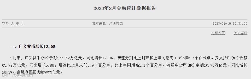2月末,广义货币(M2)余额275.52万亿元,同比增长12.9%,增速分别比上月末和上年同期高0.3个和3.7个百分点。记者注意到,当月M2同比增速创下自2016年3月以来的最高值。