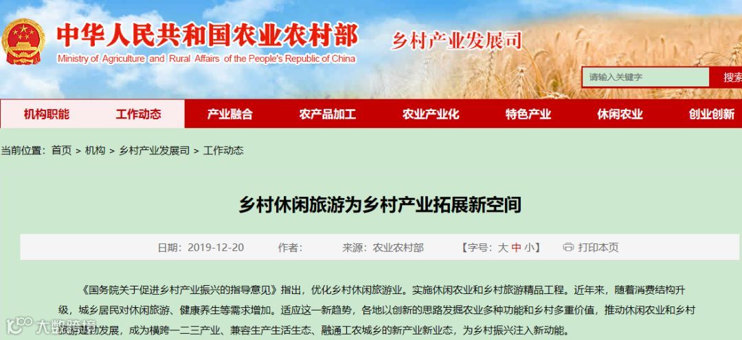 《国务院关于促进乡村产业振兴的指导意见》指出,优化乡村休闲旅游业。实施休闲农业和乡村旅游精品工程。近年来,随着消费结构升级,城乡居民对休闲旅游、健康养生等需求增加。适应这一新趋势,各地以创新的思路发掘农业多种功能和乡村多重价值,推动休闲农业和乡村旅游蓬勃发展,成为横跨一二三产业、兼容生产生活生态、融通工农城乡的新产业新业态,为乡村振兴注入新动能。
