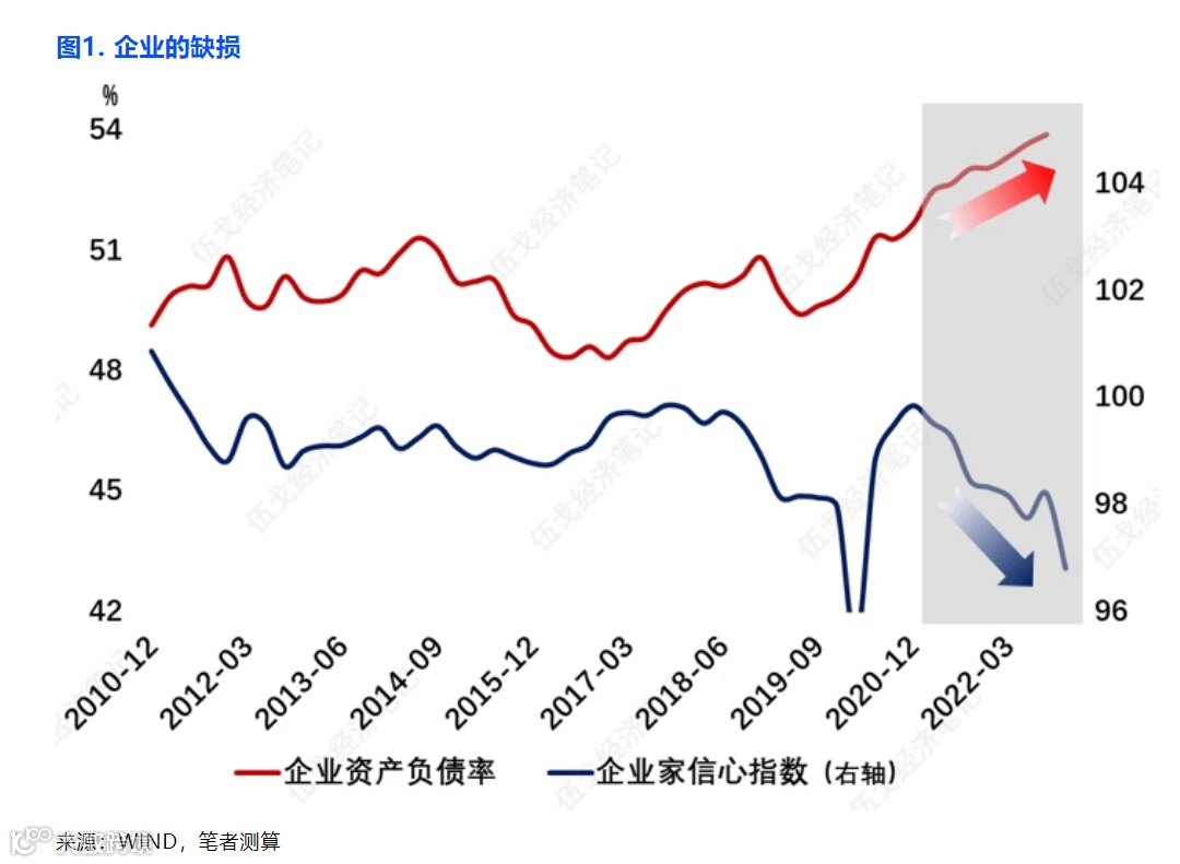 伍戈表示,经历疫情三年,企业的经营收入持续减少,不愿意进行融资扩张,即使利率下行,现金流的不断恶化,企业资产负债率明显被动上升,从某种意义上定义这种为“资产负债表受损”,这些和企业家的信心指数下降紧密结合在一起。