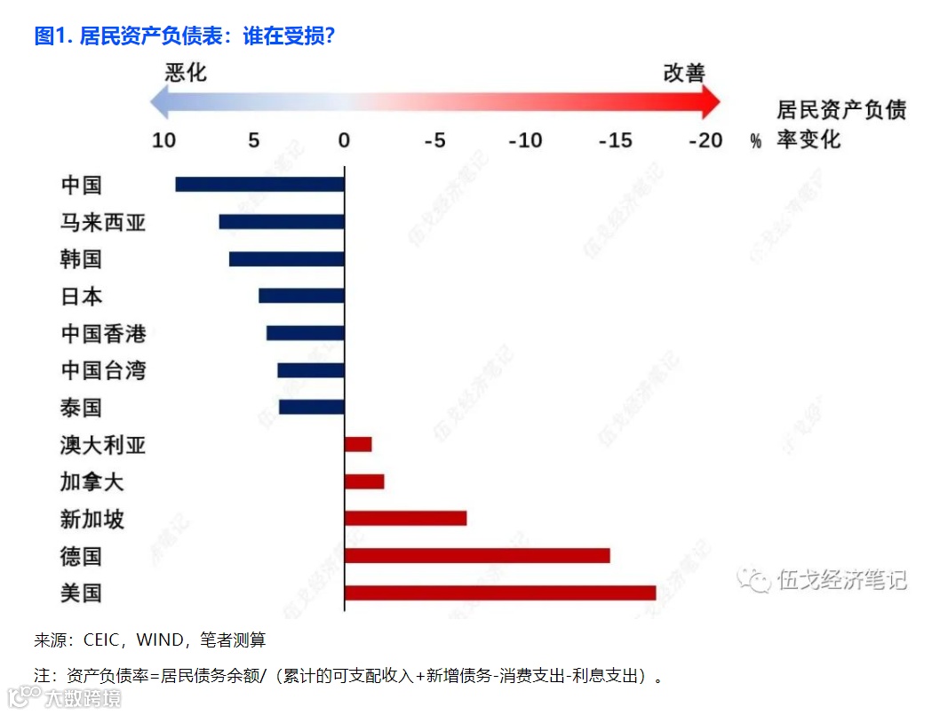 伍戈表示,从中国来看,如果先考虑中国居民家庭的资产负债表的一些变化。从疫情开始,到整个疫情防控优化,以及居民阳过之后整个历程,大概能够看得到很多国家特别是亚洲经济体,都经历了一轮家庭资产负债表受损的过程。而相较欧美经济体居民的家庭资产负债表,却没有受到明显的影响。这也许是和这些国家进行的基于居民端的刺激政策有关。
