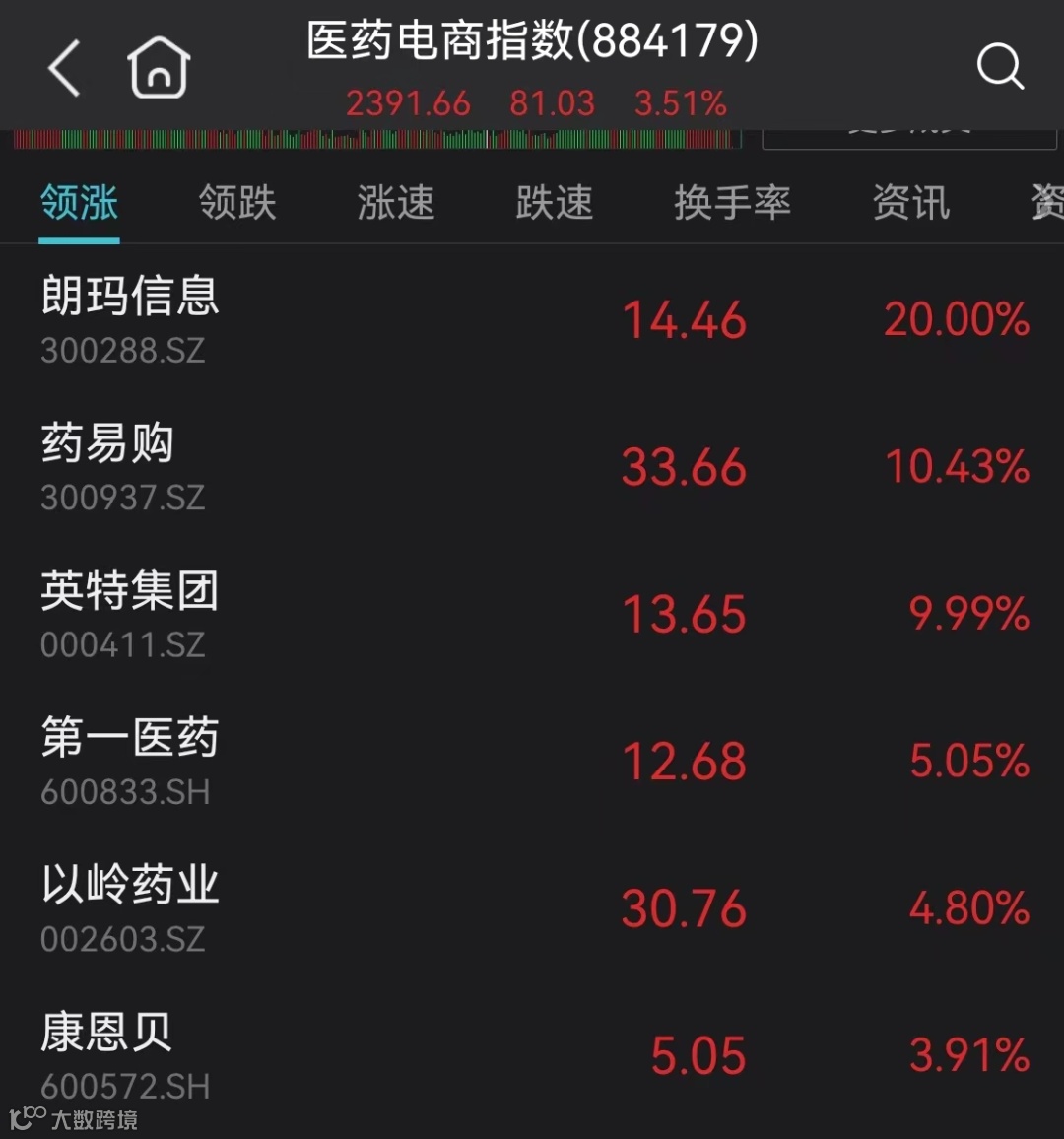 16日开盘医药商业精选指数和医药电商指数立刻展开攻势,早盘一度涨逾7%和5%,但午后沪指等大盘指数走低,两大指数攻势放缓,截至收盘,分别上涨1.59%和3.51%。个股方面,朗玛信息实现20%涨停,一度涨逾15%的药易购最终以10.43%涨幅报收,英特集团实现10%涨停,第一医药、以岭药业、一心堂等个股均实现3%以上上涨。