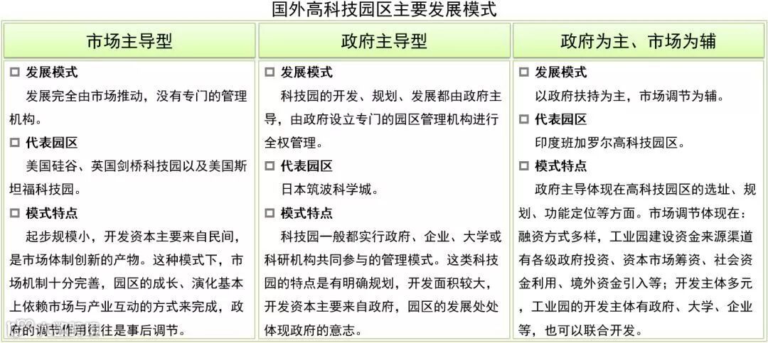 国外高科技园区的发展模式主要包括市场主导型、政府主导型和以政府扶持为主,市场调节为辅的三种发展模式。这三种高科技园区的发展模式特点如下: