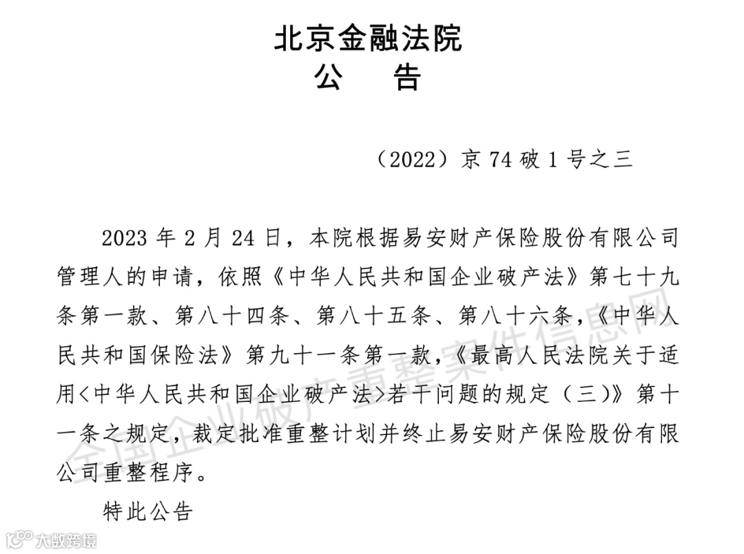 2022年6月29日,银保监会批复原则同意易安财险进入破产重整程序。2022年7月15日,北京金融法院依法裁定受理易安财险提出的破产重整申请,并指定易安财险清算组担任管理人。自2022年7月15日起,易安财险依法进入破产重整程序,并将严格按照有关法律法规要求开展后续工作。