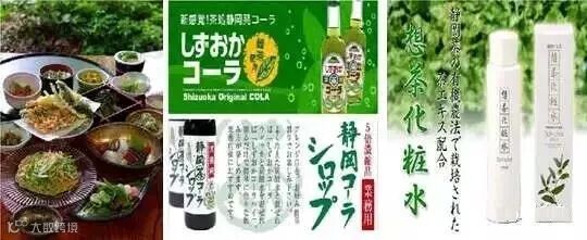 除了比较普遍的绿茶甜品外,静冈开发了独有的绿茶料理,如煎茶做的茶盐、茶叶荞麦面、茶香饭等,提供绿茶料理的餐厅备受游客欢迎。此外还开发护肤品。