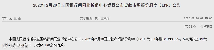 2月20日,人民银行授权全国银行间同业拆借中心公布最新贷款市场报价利率(LPR),其中1年期LPR为3.65%,5年期以上LPR为4.3%,与上月保持一致。自2022年8月非对称调降后,LPR已连续6个月维持不变。