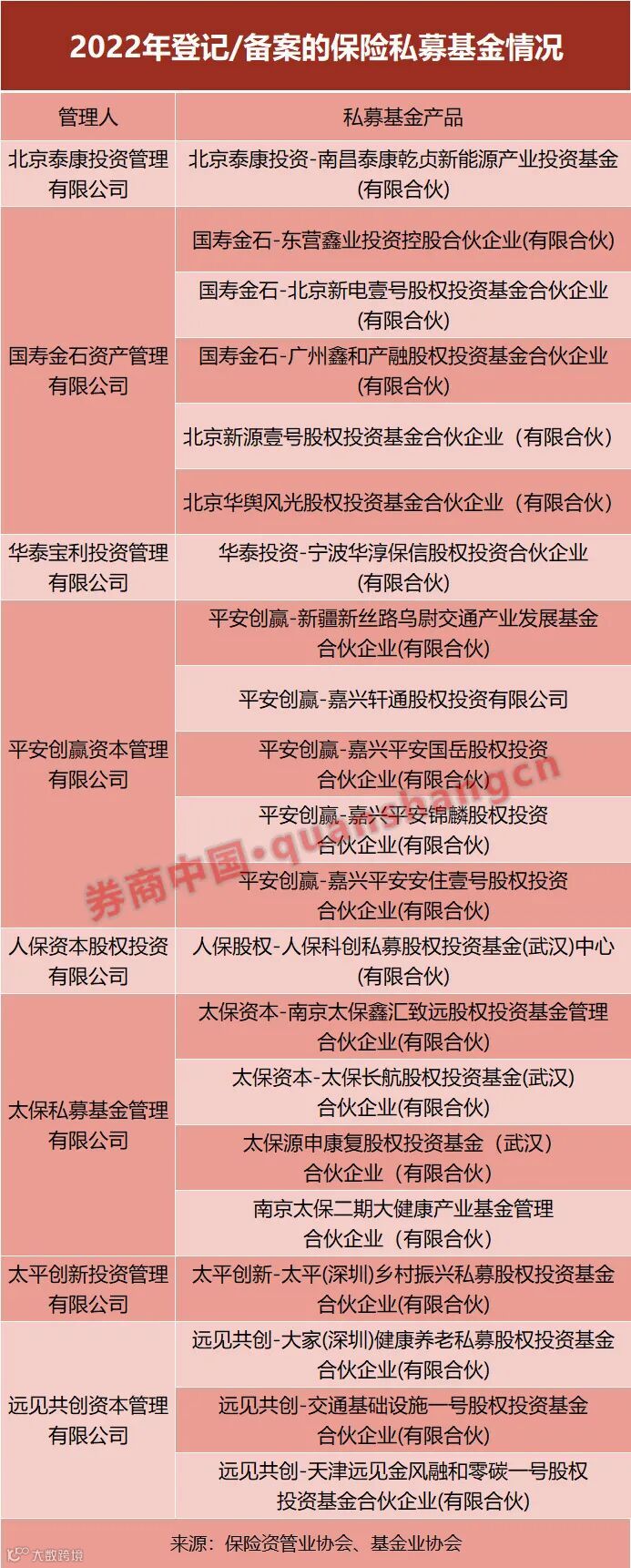 据记者不完全统计,在2022年有登记保险私募基金的管理人,包括国寿金石资管公司、平安创赢资本管理公司、太保私募基金公司、远见共创资本、人保资本股权投资公司、北京泰康投资、太平创新投资、华泰宝利投资。