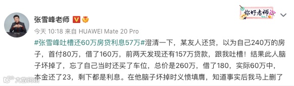 日前,考研名师张雪峰在个人微博上吐槽称“6年还60万房贷利息57万”,引发热议。2月22日,张雪峰发文道歉,表示自己没搞清具体情况,朋友弄错了。“澄清一下,某友人还贷,以为自己240万的房子,首付80万,借了160万,前两天发现还有157万贷款,跟我吐槽!结果此人脑子坏掉了,忘了自己当时还买了车位,总价是260万,借了180万,实际(还款)60万中,本金还了23万,剩下都是利息。在他脑子坏掉时义愤填膺,知道事实后我马上删了。”