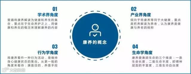 2.产业界角度:倾向于将康养等同于“大健康”,重点将“养”理解成“养老”。认为“康养”是“健康”与“养老”的统称。