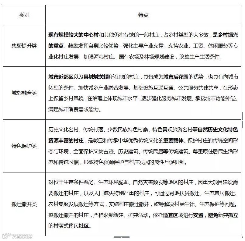 顺应村庄发展规律和演变趋势,根据不同村庄的发展现状、区位条件、资源禀赋等,按照集聚提升、融入城镇、特色保护、搬迁撤并的思路,分类推进乡村振兴,不搞一刀切,《规划》结合当前实际情况,进行了相应的四大分类(见表-2)。