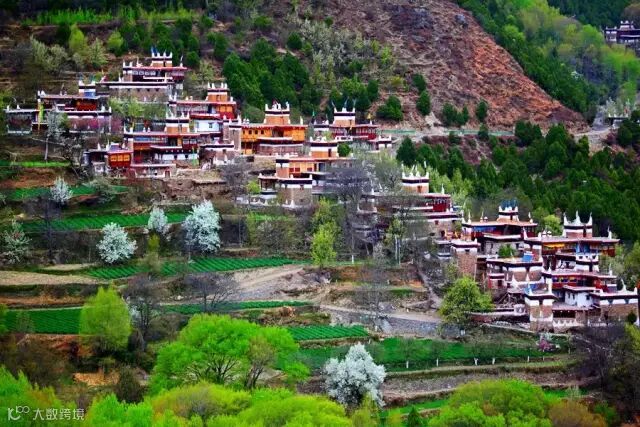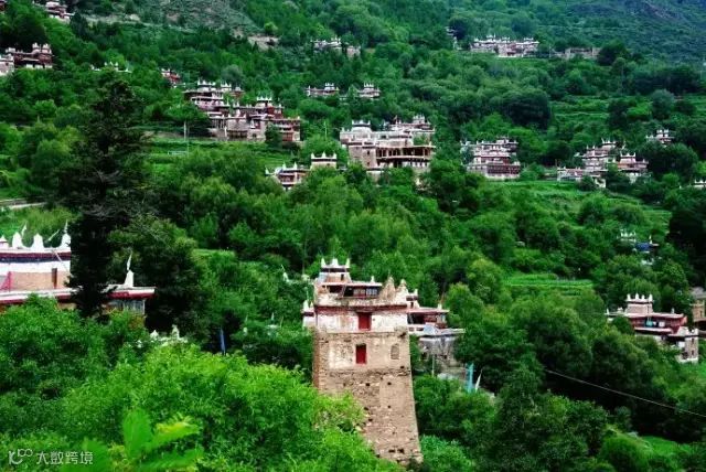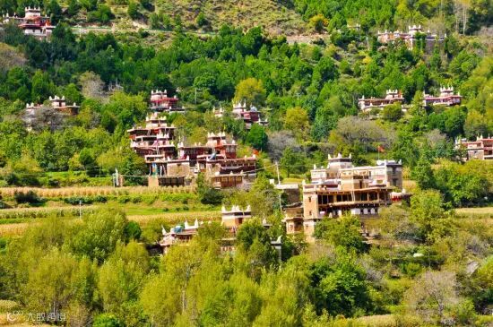 “甲居”,藏语是百户人家之意。藏寨从大金河谷层层向上攀缘,一直伸延到卡帕玛群峰脚下,整个山寨依着起伏的山势迤逦连绵,在相对高差近千米的山坡上,一幢幢藏式楼房洒落在绿树丛中。