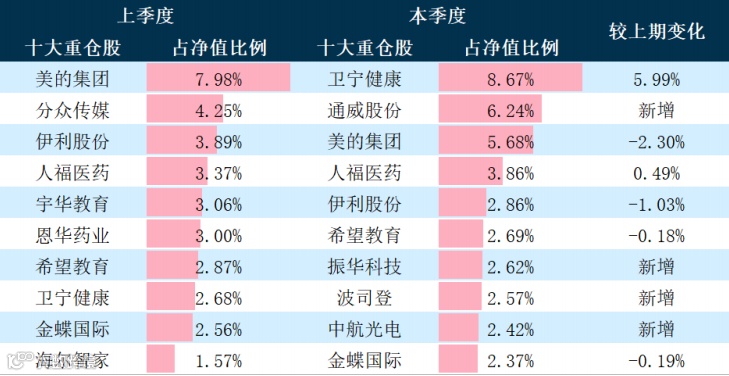 四季度招商核心竞争力混合前十大重仓股中新增四只股票。卫宁健康增持5.99%后位居榜首,通威股份是四季度新增股票,仓位6.24%位居榜二,美的集团减持2.30%退出榜首,位居榜三,报告期内该产品涨幅高达25.96%。