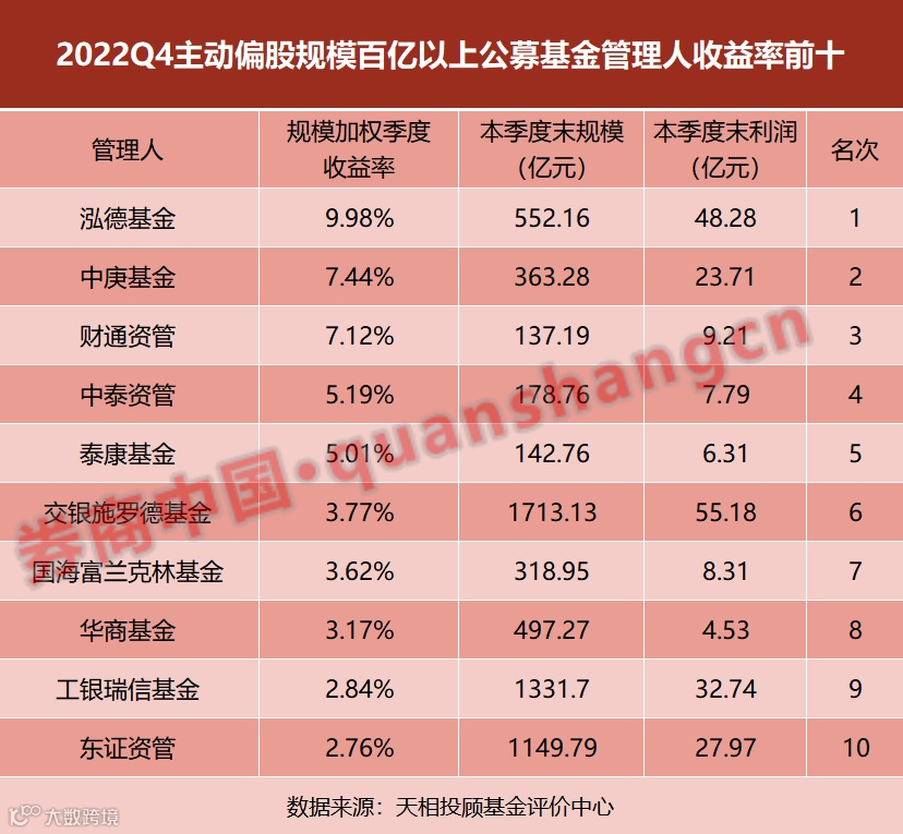 天相投顾基金评价中心统计,截至2022年四季度末,对152家公募基金管理人进行主动偏股基金产品(股票基金+偏股混合基金+灵活配置基金)规模加权季度收益率统计,排名前十的基金管理人均实现正收益率。主动偏股管理规模在百亿以上的基金管理人中,泓德基金2022年第四季度规模加权收益率为9.98%,排名第一。