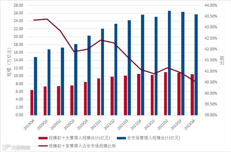 目前,公募基金管理人2022年四季度报告已基本披露完毕,以下对四季度公募基金管理人规模、业绩、绩优基金经理调仓等情况进行盘点。截至2022年四季度末,前十大管理人规模合计10.44万亿元,全市场基金管理人规模合计25.74万亿元,前十大管理人规模占比40.56%,占比较上季度末下降0.38%。近三年,前十大管理人合计规模占比整体呈现下降趋势。