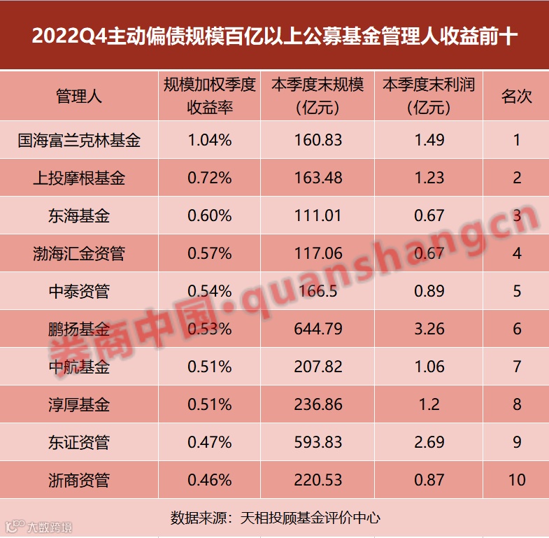 截至2022年四季度末,对152家公募基金管理人进行主动偏债基金产品(偏债混合基金+纯债债券基金+混债债券基金)规模加权季度收益率统计,国海富兰克林基金以1.04%的季度收益率在百亿规模以上排名第一,仅部分规模不到千亿的基金管理人实现正收益,大部分基金管理人未能实现盈利。