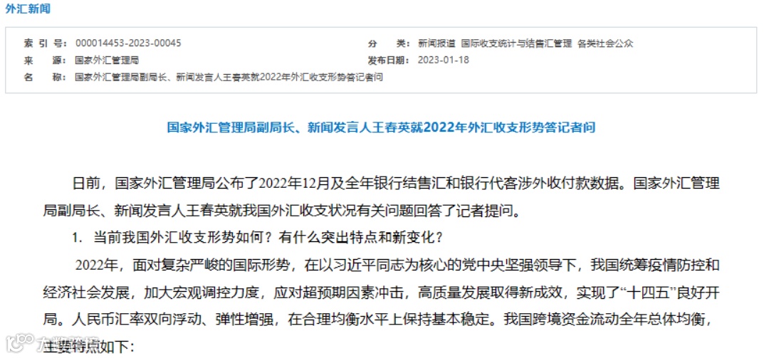 1月18日,国家外汇管理局公布2022年12月及全年银行结售汇和银行代客涉外收付款数据。国家外汇管理局副局长、新闻发言人王春英就我国外汇收支状况有关问题回答了记者提问。