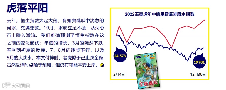 回顾在即将过去的虎年,恒生指数大起大落。从去年预测的准确度来看,在中信里昂证券2022年的风水指南中,所预测到的恒生指数走势变化与市场实际情况有相似之处,但市场在年末的反弹时点晚于中信里昂去年的预测。