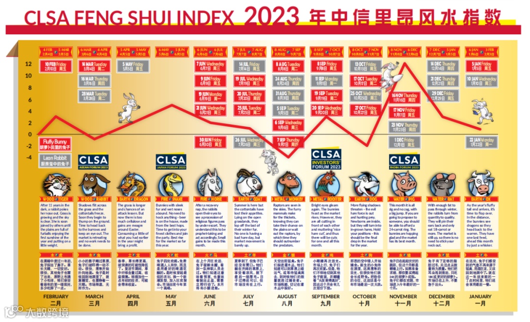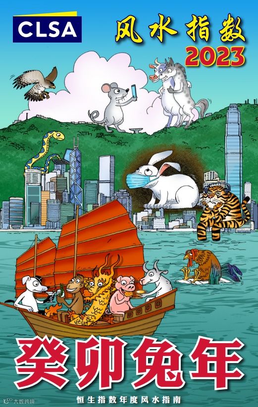 生肖运程方面,根据中信里昂证券预测,经历大起大跌的虎年,大部份生肖将能在来年稍稍喘息。不怕猛禽的狗、猴、羊、猪和龙将迎来一年好运。这些派对动物将在船河上欢享美味,大吃大喝。鼠、牛和马运势上佳,利于出行远足、培养摄影等爱好。焦虑的兔和无聊的虎虽有顾虑,但来年也算顺利。另外,可怜的蛇在办公室埋头苦干。不幸的是,一年中鸡的运势最差,不但会落水,还要提防鹰隼的扑击。