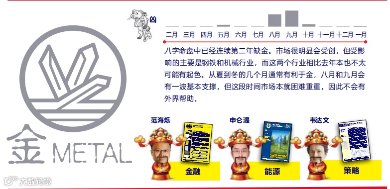 中信里昂指南还提到,兔年已是连续第二年缺金。市场很明显会受创,但受影响的主要是钢铁和机械行业,而这两个行业相比去年本也不太可能有起色。从夏到冬的几个月通常有利于金,八月和九月会有一波基本支撑,但这段时间市场本就困难重重,因此不会有外界帮助。