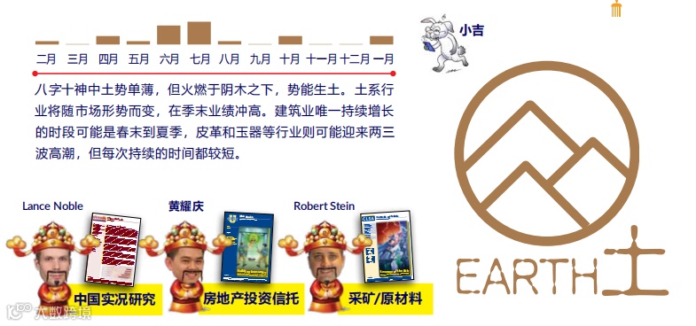 另一方面,土系的房地产、建筑业和水系的旅游、酒店和运输业很可能表现平平。这也许让人失望,但对正苦苦挣扎的旅游和房地产业而言,这可能已是有所好转。由于八字再次缺金,金融和以金属为原材料的行业,如电池制造,将持续受压。