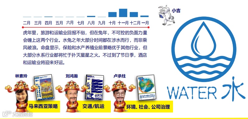 水系行业方面,虎年里,旅游和运输业回报不俗,但在兔年,不可控的负面力量会缠上这两个行业。保险和水产养殖业前景略优于其他行业,但大部分水系行业都将忙于扑灭星星之火。不过到了节日季,酒店和运输业将迎来好运。