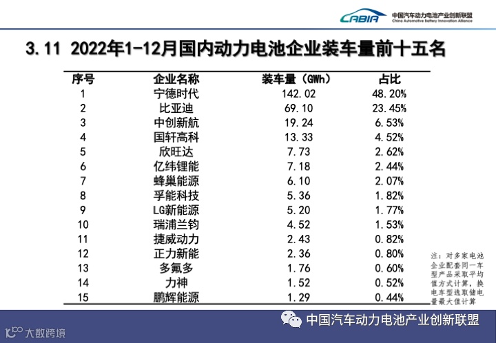 此外,1月12日,中国汽车动力电池产业创新联盟发布数据显示,2022年全年,中国动力电池装车量294.6GWh,同比增长90.7%。国内动力电池企业装车量前十名依次为:宁德时代、比亚迪、中创新航、国轩高科、欣旺达、亿纬锂能、蜂巢能源、孚能科技、LG新能源、瑞浦兰钧。其中,宁德时代以48.20%的占比稳居第一。比亚迪占比23.45%,中创新航占比6.53%。