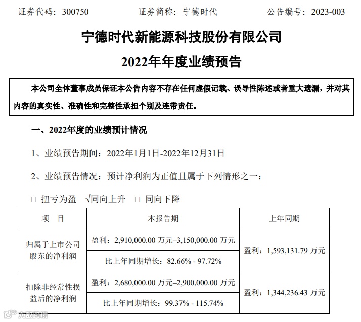 1月12日晚间,全球动力电池龙头老大,万亿市值的宁德时代披露了业绩预告,公司预计2022年度实现净利润291亿元—315亿元,同比增长82.66%-97.72%,上年同期净利为159亿元。