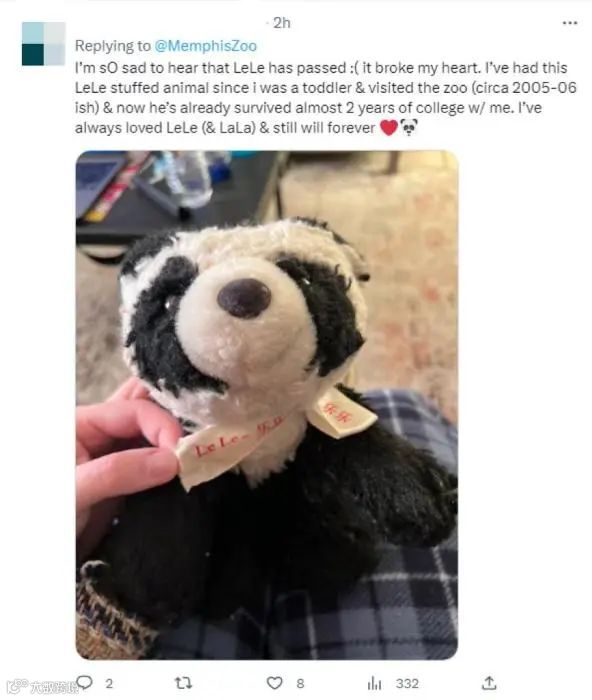有网友写道,“听到乐乐去世的消息,我很难过,心都碎了。我从小就有了这个乐乐毛绒玩具,还在2005年-2006年去过动物园(看它)。现在乐乐毛绒玩具又陪伴我度过了2年的大学时光。我一直爱乐乐,也会永远爱下去。”
