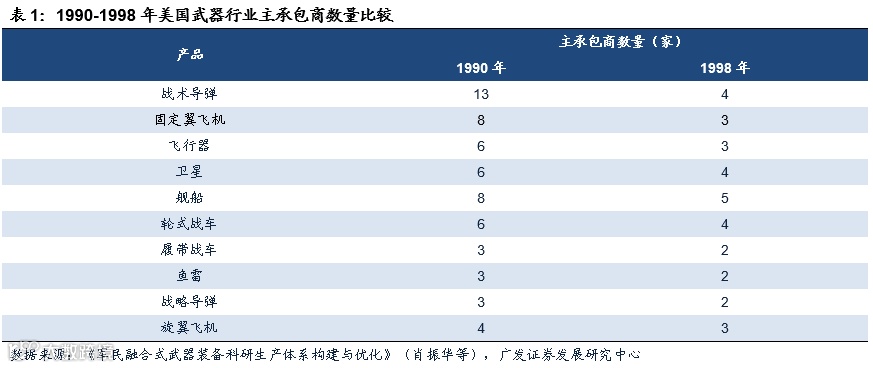 政府间接推动并购重组,快速整合军工产业重复产能。1993年,时任美国国防部次长威廉·佩里在一次各军工主管参加的晚宴上公开鼓励军工企业合并,随后国防部借助军工订单,推动了军工企业间的横向合并。从1990年到2001年,美国大型军工企业通过兼并由32家减少到9家。到2000年以后,美国前五家军工企业分别是洛克希德·马丁、波音、通用、雷神和诺斯罗普·格鲁门公司。并购重组合理调整国防工业产业结构,快速削减过剩产能,其协同效应增强了各巨头的研发和生产实力。