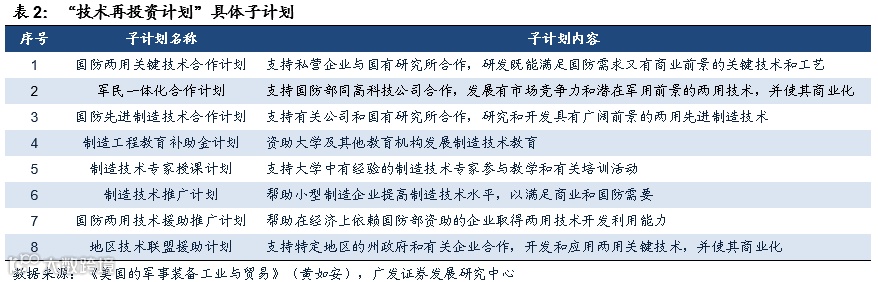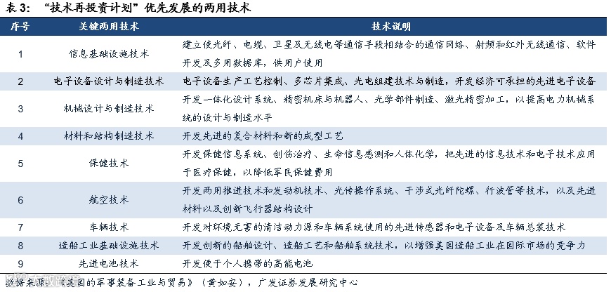 持续颁布军民融合计划,推动军民两用技术研发工作。为鼓励开发军民两用技术,美国于1993年出台的“技术再投资计划”,推动军民两用技术的研发,并颁布若干配套计划持续跟进研发工作:
