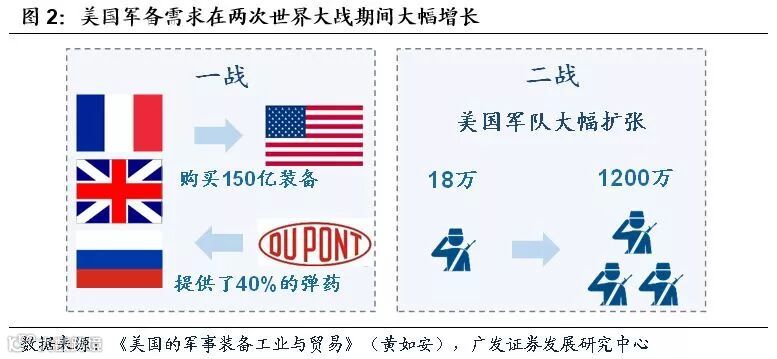 两次世界大战期间,美国军备内需和出口双增长。《租借法案》的签署使得美国承担起为盟军保障军用物资供应的任务,使得美国军备出口量大幅增长。二战期间,美国武器装备生产量占盟国生产总量的一半以上。