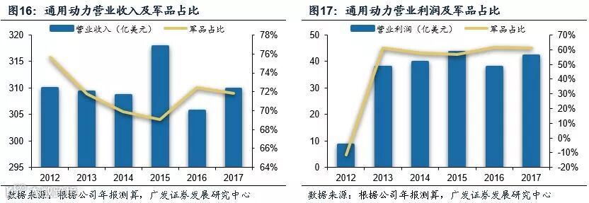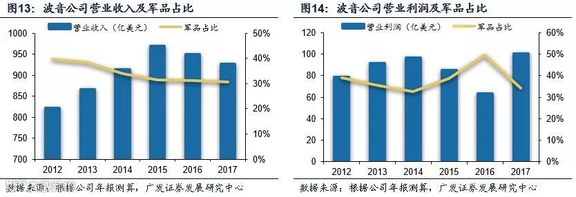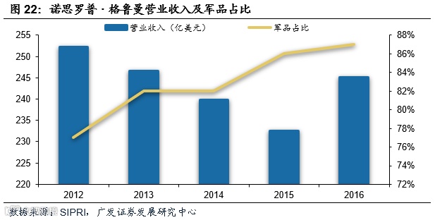 诺思罗普·格鲁曼公司军品贡献主要营收。军品贡献诺思罗普·格鲁曼公司主要收入,且营收占比逐年提升,由2012年的77%提升到2016年的87%,主要系国防订单增加所致。
