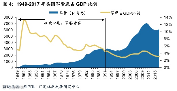 军备竞赛推动军工产业规模扩大、技术升级。1947年杜鲁门主义拉开冷战序幕,美国开启了长达40余年,耗资超13万亿美元的军备竞赛。美国持续增加国防开支,在1948年-1960年期间,美国军费预算年复合增长率约为6.5%,是以10年为观察期的最快增速阶段。20世纪70年代,美国军工产业的主承包商和转包商数目高达13万家,而军工产业的核心从制造向研发转变,产业创新在航空、航天、电子等领域快速推进。
